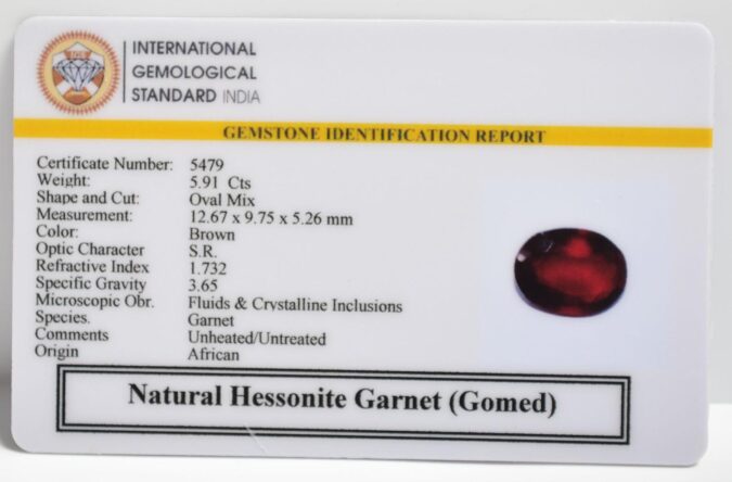 Beautiful 5.91 Cts Natural Hessonite Garnet (Gomed) (Very Good-Mines) sva 6+ Ratti HESSONITE GOMED. Free Horoscope & Free Pundit Ji Astrological Advise / Consultation. Original Natural Lab certified gems by IGI GTL / Birth stones / Large Gem Selection of shree shubh Rashi Ratan Vedic dhan at Gem Mines. May Bhagwan Brahma, Vishnu, Shiv & Universe bless you.