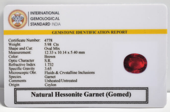 Beautiful 5.98 Cts Natural Hessonite Garnet (Gomed) (AAA-Mines) sva 6+ Ratti HESSONITE GOMED. Free Horoscope & Free Pundit Ji Astrological Advise / Consultation. Original Natural Lab certified gems by IGI GTL / Birth stones / Large Gem Selection of shree shubh Rashi Ratan Vedic dhan at Gem Mines. May Bhagwan Brahma, Vishnu, Shiv & Universe bless you.
