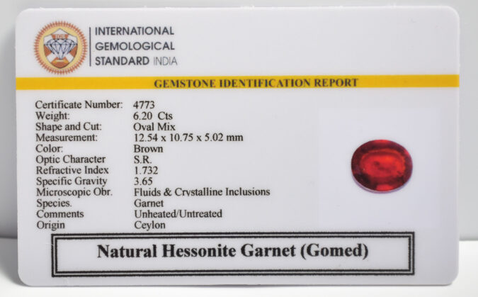 Beautiful 6.2 Cts Natural Hessonite Garnet (Gomed) (AAA-Mines) sva 6+ Ratti HESSONITE GOMED. Free Horoscope & Free Pundit Ji Astrological Advise / Consultation. Original Natural Lab certified gems by IGI GTL / Birth stones / Large Gem Selection of shree shubh Rashi Ratan Vedic dhan at Gem Mines. May Bhagwan Brahma, Vishnu, Shiv & Universe bless you.