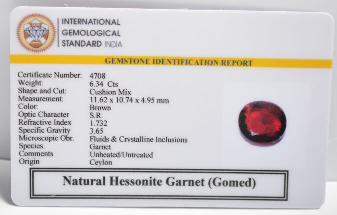 Beautiful 6.34 Cts Natural Hessonite Garnet (Gomed) (Very Good-Mines) sva 7+ Ratti HESSONITE GOMED. Free Horoscope & Free Pundit Ji Astrological Advise / Consultation. Original Natural Lab certified gems by IGI GTL / Birth stones / Large Gem Selection of shree shubh Rashi Ratan Vedic dhan at Gem Mines. May Bhagwan Brahma, Vishnu, Shiv & Universe bless you.
