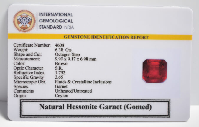 Beautiful 6.38 Cts Natural Hessonite Garnet (Gomed) (Top-Mines) sva 7+ Ratti HESSONITE GOMED. Free Horoscope & Free Pundit Ji Astrological Advise / Consultation. Original Natural Lab certified gems by IGI GTL / Birth stones / Large Gem Selection of shree shubh Rashi Ratan Vedic dhan at Gem Mines. May Bhagwan Brahma, Vishnu, Shiv & Universe bless you.