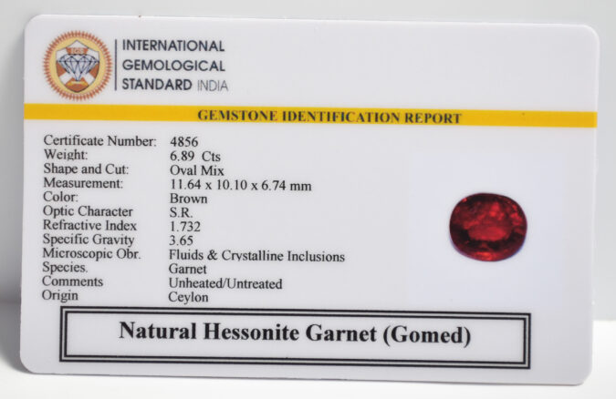 Beautiful 6.89 Cts Natural Hessonite Garnet (Gomed) (AAA+-Mines) sva 7+ Ratti HESSONITE GOMED. Free Horoscope & Free Pundit Ji Astrological Advise / Consultation. Original Natural Lab certified gems by IGI GTL / Birth stones / Large Gem Selection of shree shubh Rashi Ratan Vedic dhan at Gem Mines. May Bhagwan Brahma, Vishnu, Shiv & Universe bless you.