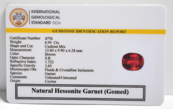 Beautiful 6.95 Cts Natural Hessonite Garnet (Gomed) (AAA-Mines) sva 7+ Ratti HESSONITE GOMED. Free Horoscope & Free Pundit Ji Astrological Advise / Consultation. Original Natural Lab certified gems by IGI GTL / Birth stones / Large Gem Selection of shree shubh Rashi Ratan Vedic dhan at Gem Mines. May Bhagwan Brahma, Vishnu, Shiv & Universe bless you.