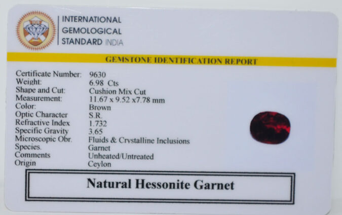Beautiful 6.98 Cts Natural Hessonite Garnet (AAA+-Mines) sva 7+ Ratti HESSONITE GOMED. Free Horoscope & Free Pundit Ji Astrological Advise / Consultation. Original Natural Lab certified gems by IGI GTL / Birth stones / Large Gem Selection of shree shubh Rashi Ratan Vedic dhan at Gem Mines. May Bhagwan Brahma, Vishnu, Shiv & Universe bless you.