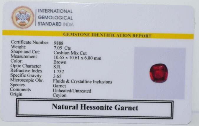 Beautiful 7.05 Cts Natural Hessonite Garnet (Top-Mines) sva 7+ Ratti HESSONITE GOMED. Free Horoscope & Free Pundit Ji Astrological Advise / Consultation. Original Natural Lab certified gems by IGI GTL / Birth stones / Large Gem Selection of shree shubh Rashi Ratan Vedic dhan at Gem Mines. May Bhagwan Brahma, Vishnu, Shiv & Universe bless you.