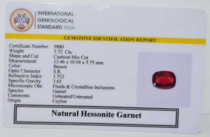 Beautiful 7.72 Cts Natural Hessonite Garnet (AAA+-Mines) sva 8+ Ratti HESSONITE GOMED. Free Horoscope & Free Pundit Ji Astrological Advise / Consultation. Original Natural Lab certified gems by IGI GTL / Birth stones / Large Gem Selection of shree shubh Rashi Ratan Vedic dhan at Gem Mines. May Bhagwan Brahma, Vishnu, Shiv & Universe bless you.