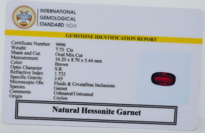Beautiful 7.73 Cts Natural Hessonite Garnet (AAA+-Mines) sva 8+ Ratti HESSONITE GOMED. Free Horoscope & Free Pundit Ji Astrological Advise / Consultation. Original Natural Lab certified gems by IGI GTL / Birth stones / Large Gem Selection of shree shubh Rashi Ratan Vedic dhan at Gem Mines. May Bhagwan Brahma, Vishnu, Shiv & Universe bless you.