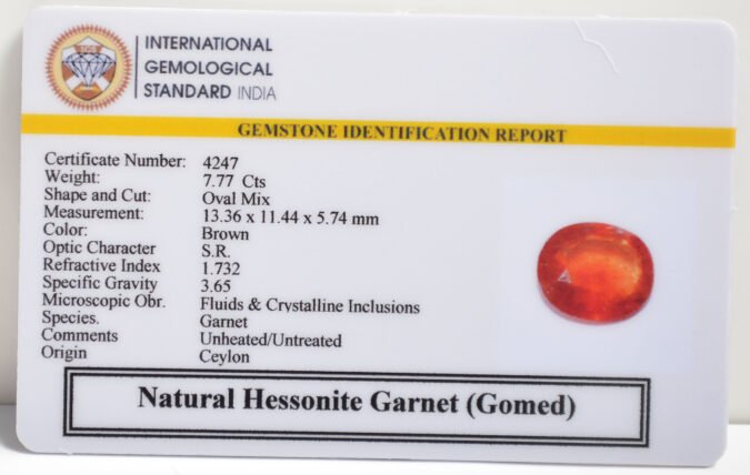 Beautiful 7.77 Cts Natural Hessonite Garnet (Gomed) (Top-Mines) sva 8+ Ratti HESSONITE GOMED. Free Horoscope & Free Pundit Ji Astrological Advise / Consultation. Original Natural Lab certified gems by IGI GTL / Birth stones / Large Gem Selection of shree shubh Rashi Ratan Vedic dhan at Gem Mines. May Bhagwan Brahma, Vishnu, Shiv & Universe bless you.