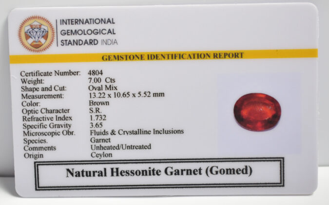 Beautiful 7 Cts Natural Hessonite Garnet (Gomed) (Top-Mines) sva 7+ Ratti HESSONITE GOMED. Free Horoscope & Free Pundit Ji Astrological Advise / Consultation. Original Natural Lab certified gems by IGI GTL / Birth stones / Large Gem Selection of shree shubh Rashi Ratan Vedic dhan at Gem Mines. May Bhagwan Brahma, Vishnu, Shiv & Universe bless you.