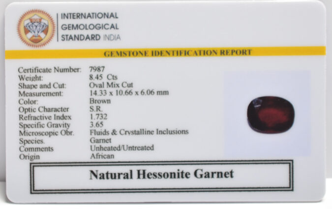 Beautiful 8.45 Cts Natural Hessonite Garnet (Very Good-Mines) sva 9+ Ratti HESSONITE GOMED. Free Horoscope & Free Pundit Ji Astrological Advise / Consultation. Original Natural Lab certified gems by IGI GTL / Birth stones / Large Gem Selection of shree shubh Rashi Ratan Vedic dhan at Gem Mines. May Bhagwan Brahma, Vishnu, Shiv & Universe bless you.