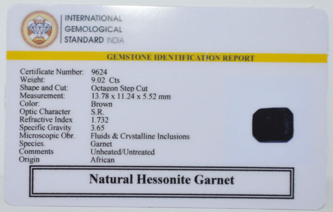 Beautiful 9.02 Cts Natural Hessonite Garnet (AAA-Mines) sva 10+ Ratti HESSONITE GOMED. Free Horoscope & Free Pundit Ji Astrological Advise / Consultation. Original Natural Lab certified gems by IGI GTL / Birth stones / Large Gem Selection of shree shubh Rashi Ratan Vedic dhan at Gem Mines. May Bhagwan Brahma, Vishnu, Shiv & Universe bless you.