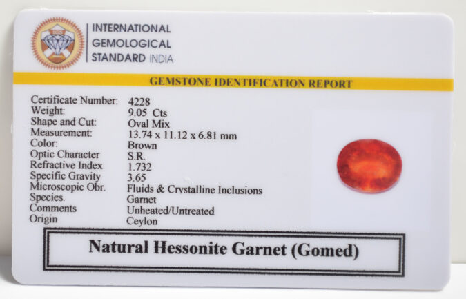 Beautiful 9.05 Cts Natural Hessonite Garnet (Gomed) (AAA+-Mines) sva 10+ Ratti HESSONITE GOMED. Free Horoscope & Free Pundit Ji Astrological Advise / Consultation. Original Natural Lab certified gems by IGI GTL / Birth stones / Large Gem Selection of shree shubh Rashi Ratan Vedic dhan at Gem Mines. May Bhagwan Brahma, Vishnu, Shiv & Universe bless you.