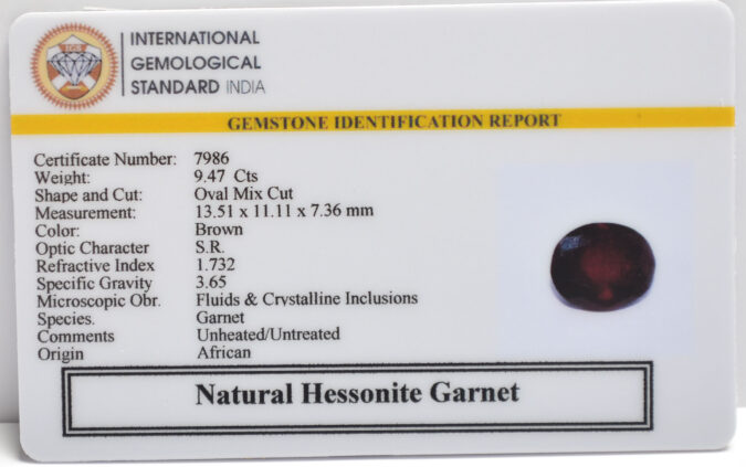 Beautiful 9.47 Cts Natural Hessonite Garnet (Very Good-Mines) sva 10+ Ratti HESSONITE GOMED. Free Horoscope & Free Pundit Ji Astrological Advise / Consultation. Original Natural Lab certified gems by IGI GTL / Birth stones / Large Gem Selection of shree shubh Rashi Ratan Vedic dhan at Gem Mines. May Bhagwan Brahma, Vishnu, Shiv & Universe bless you.