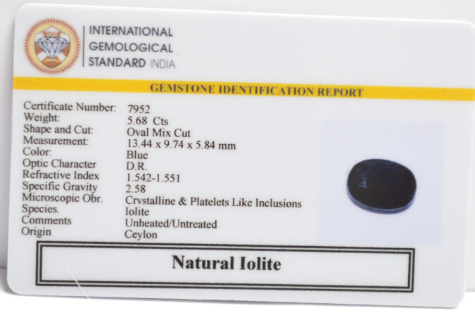 Beautiful 5.68 Cts Natural Iolite (AAA-Mines) sva 6+ Ratti IOLITE NILLI. Free Horoscope & Free Pundit Ji Astrological Advise / Consultation. Original Natural Lab certified gems by IGI GTL / Birth stones / Large Gem Selection of shree shubh Rashi Ratan Vedic dhan at Gem Mines. May Bhagwan Brahma, Vishnu, Shiv & Universe bless you.