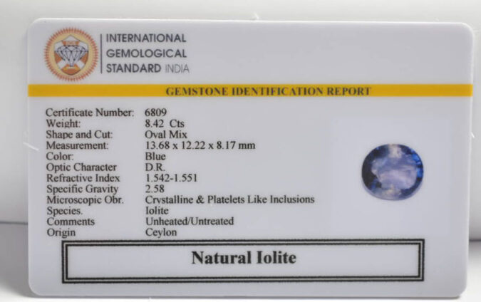 Beautiful 8.42 Cts Natural Iolite (Top+-Mines) sva 9+ Ratti IOLITE NILLI. Free Horoscope & Free Pundit Ji Astrological Advise / Consultation. Original Natural Lab certified gems by IGI GTL / Birth stones / Large Gem Selection of shree shubh Rashi Ratan Vedic dhan at Gem Mines. May Bhagwan Brahma, Vishnu, Shiv & Universe bless you.