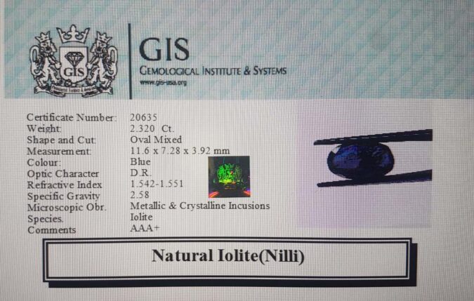 Beautiful 2.32 Ct. Iolite(Nilli) (Brazilian Mines) Sava 2 Ratti Nilli. Free Horoscope & Free Pundit Ji Advise / Consultation. Original Natural Lab certified gems by IGI GTL / Birth stones / Large Gem Selection of shree shubh Rashi Ratan Vedic dhan at Gem Mines. May Bhagwan Brahma, Vishnu, Shiv & Universe bless you.