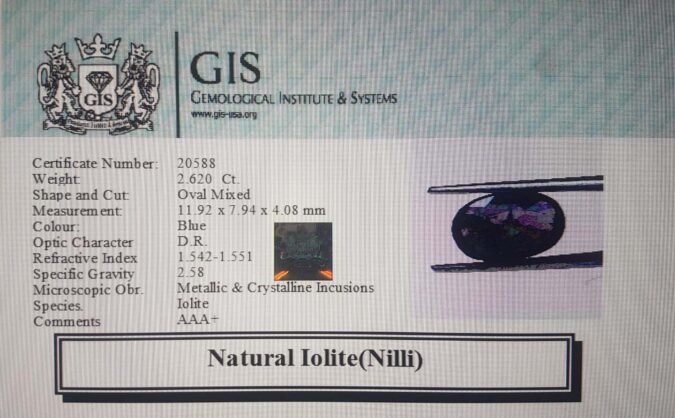Beautiful 2.62 Ct. Iolite(Nilli) (Brazilian Mines) Sava 2 Ratti Nilli. Free Horoscope & Free Pundit Ji Advise / Consultation. Original Natural Lab certified gems by IGI GTL / Birth stones / Large Gem Selection of shree shubh Rashi Ratan Vedic dhan at Gem Mines. May Bhagwan Brahma, Vishnu, Shiv & Universe bless you.