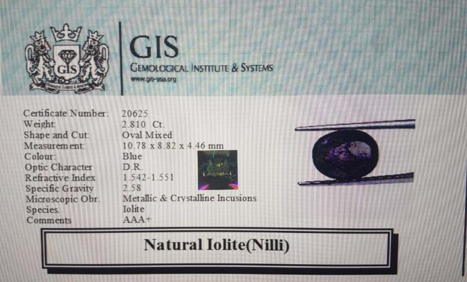 Beautiful 2.81 Ct. Iolite(Nilli) (Brazilian Mines) Sava 3 Ratti Nilli. Free Horoscope & Free Pundit Ji Advise / Consultation. Original Natural Lab certified gems by IGI GTL / Birth stones / Large Gem Selection of shree shubh Rashi Ratan Vedic dhan at Gem Mines. May Bhagwan Brahma, Vishnu, Shiv & Universe bless you.