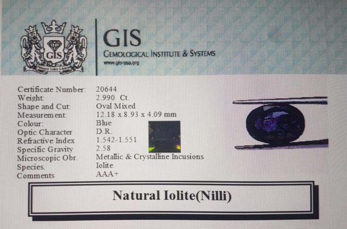Beautiful 2.99 Ct. Iolite(Nilli) (Brazilian Mines) Sava 3 Ratti Nilli. Free Horoscope & Free Pundit Ji Advise / Consultation. Original Natural Lab certified gems by IGI GTL / Birth stones / Large Gem Selection of shree shubh Rashi Ratan Vedic dhan at Gem Mines. May Bhagwan Brahma, Vishnu, Shiv & Universe bless you.