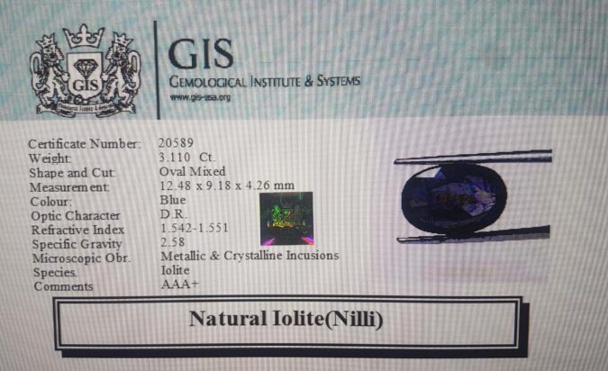 Beautiful 3.11 Ct. Iolite(Nilli) (Brazilian Mines) Sava 3 Ratti Nilli. Free Horoscope & Free Pundit Ji Advise / Consultation. Original Natural Lab certified gems by IGI GTL / Birth stones / Large Gem Selection of shree shubh Rashi Ratan Vedic dhan at Gem Mines. May Bhagwan Brahma, Vishnu, Shiv & Universe bless you.
