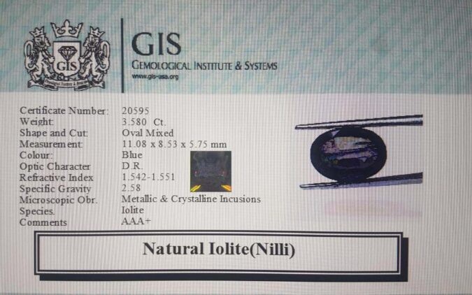 Beautiful 3.58 Ct. Iolite(Nilli) (Brazilian Mines) Sava 3 Ratti Nilli. Free Horoscope & Free Pundit Ji Advise / Consultation. Original Natural Lab certified gems by IGI GTL / Birth stones / Large Gem Selection of shree shubh Rashi Ratan Vedic dhan at Gem Mines. May Bhagwan Brahma, Vishnu, Shiv & Universe bless you.