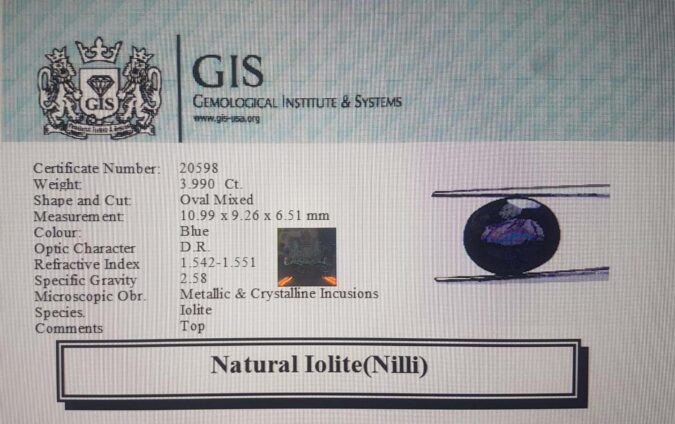Beautiful 3.99 Ct. Iolite(Nilli) (Brazilian Mines) Sava 4 Ratti Nilli. Free Horoscope & Free Pundit Ji Advise / Consultation. Original Natural Lab certified gems by IGI GTL / Birth stones / Large Gem Selection of shree shubh Rashi Ratan Vedic dhan at Gem Mines. May Bhagwan Brahma, Vishnu, Shiv & Universe bless you.