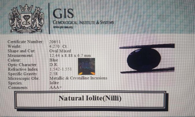Beautiful 4.27 Ct. Iolite(Nilli) (Brazilian Mines) Sava 4 Ratti Nilli. Free Horoscope & Free Pundit Ji Advise / Consultation. Original Natural Lab certified gems by IGI GTL / Birth stones / Large Gem Selection of shree shubh Rashi Ratan Vedic dhan at Gem Mines. May Bhagwan Brahma, Vishnu, Shiv & Universe bless you.