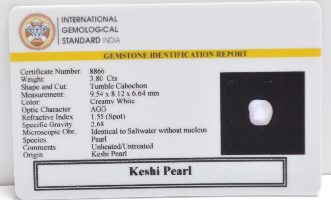 Beautiful 3.8 Cts Keshi Pearl (AAA+-Mines) sva 4+ Ratti KESHI PEARL. Free Horoscope & Free Pundit Ji Astrological Advise / Consultation. Original Natural Lab certified gems by IGI GTL / Birth stones / Large Gem Selection of shree shubh Rashi Ratan Vedic dhan at Gem Mines. May Bhagwan Brahma, Vishnu, Shiv & Universe bless you.