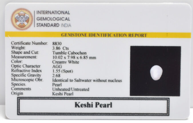 Beautiful 3.86 Cts Keshi Pearl (Top+-Mines) sva 4+ Ratti KESHI PEARL. Free Horoscope & Free Pundit Ji Astrological Advise / Consultation. Original Natural Lab certified gems by IGI GTL / Birth stones / Large Gem Selection of shree shubh Rashi Ratan Vedic dhan at Gem Mines. May Bhagwan Brahma, Vishnu, Shiv & Universe bless you.