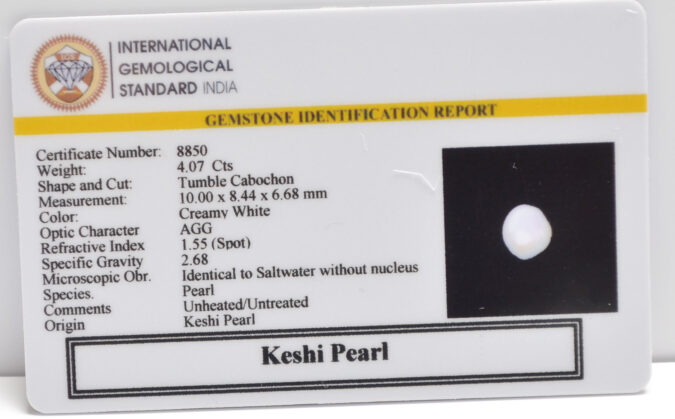Beautiful 4.07 Cts Keshi Pearl (Top-Mines) sva 4+ Ratti KESHI PEARL. Free Horoscope & Free Pundit Ji Astrological Advise / Consultation. Original Natural Lab certified gems by IGI GTL / Birth stones / Large Gem Selection of shree shubh Rashi Ratan Vedic dhan at Gem Mines. May Bhagwan Brahma, Vishnu, Shiv & Universe bless you.