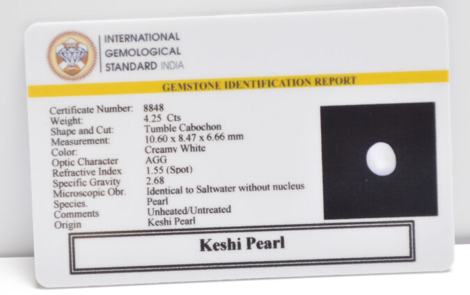 Beautiful 4.25 Cts Keshi Pearl (Top-Mines) sva 4+ Ratti KESHI PEARL. Free Horoscope & Free Pundit Ji Astrological Advise / Consultation. Original Natural Lab certified gems by IGI GTL / Birth stones / Large Gem Selection of shree shubh Rashi Ratan Vedic dhan at Gem Mines. May Bhagwan Brahma, Vishnu, Shiv & Universe bless you.