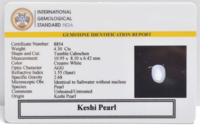 Beautiful 4.3 Cts Keshi Pearl (Top-Mines) sva 4+ Ratti KESHI PEARL. Free Horoscope & Free Pundit Ji Astrological Advise / Consultation. Original Natural Lab certified gems by IGI GTL / Birth stones / Large Gem Selection of shree shubh Rashi Ratan Vedic dhan at Gem Mines. May Bhagwan Brahma, Vishnu, Shiv & Universe bless you.
