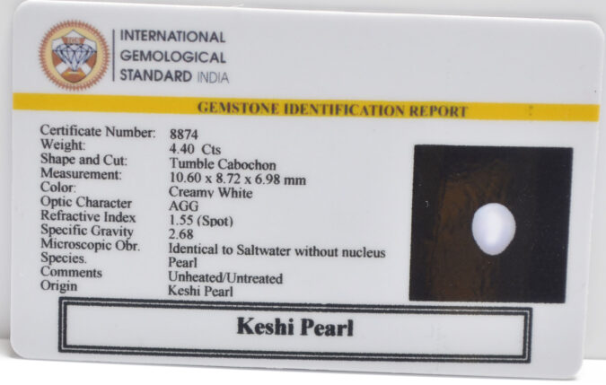 Beautiful 4.4 Cts Keshi Pearl (AAA+-Mines) sva 4+ Ratti KESHI PEARL. Free Horoscope & Free Pundit Ji Astrological Advise / Consultation. Original Natural Lab certified gems by IGI GTL / Birth stones / Large Gem Selection of shree shubh Rashi Ratan Vedic dhan at Gem Mines. May Bhagwan Brahma, Vishnu, Shiv & Universe bless you.