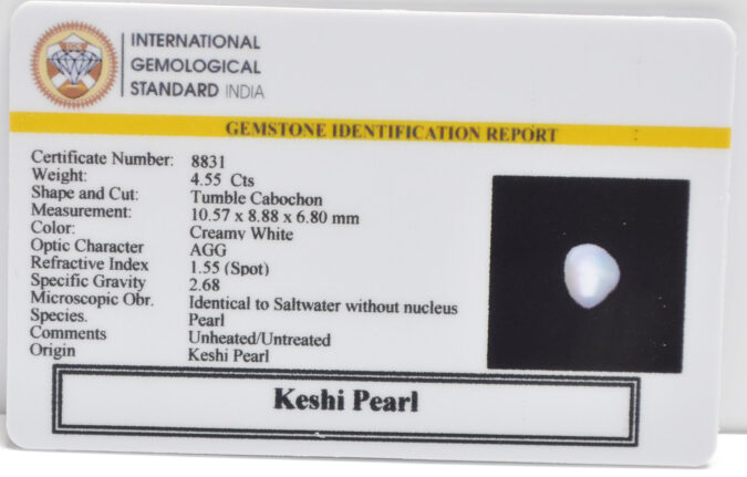 Beautiful 4.55 Cts Keshi Pearl (AAA+-Mines) sva 5+ Ratti KESHI PEARL. Free Horoscope & Free Pundit Ji Astrological Advise / Consultation. Original Natural Lab certified gems by IGI GTL / Birth stones / Large Gem Selection of shree shubh Rashi Ratan Vedic dhan at Gem Mines. May Bhagwan Brahma, Vishnu, Shiv & Universe bless you.