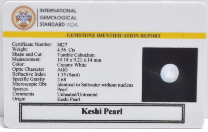 Beautiful 4.56 Cts Keshi Pearl (Top-Mines) sva 5+ Ratti KESHI PEARL. Free Horoscope & Free Pundit Ji Astrological Advise / Consultation. Original Natural Lab certified gems by IGI GTL / Birth stones / Large Gem Selection of shree shubh Rashi Ratan Vedic dhan at Gem Mines. May Bhagwan Brahma, Vishnu, Shiv & Universe bless you.