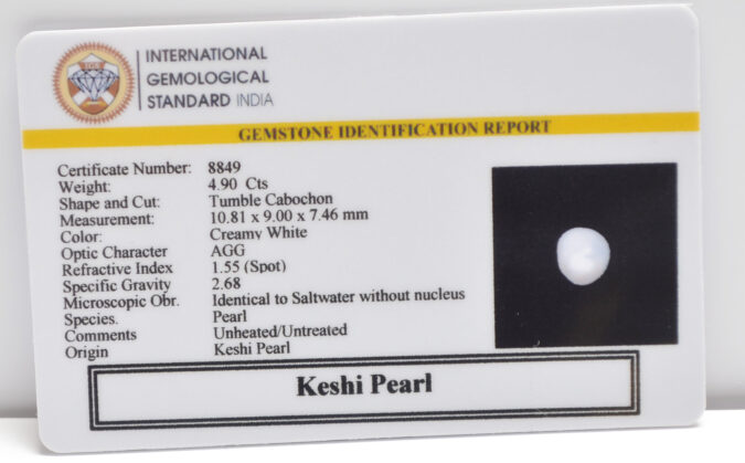 Beautiful 4.9 Cts Keshi Pearl (Top-Mines) sva 5+ Ratti KESHI PEARL. Free Horoscope & Free Pundit Ji Astrological Advise / Consultation. Original Natural Lab certified gems by IGI GTL / Birth stones / Large Gem Selection of shree shubh Rashi Ratan Vedic dhan at Gem Mines. May Bhagwan Brahma, Vishnu, Shiv & Universe bless you.