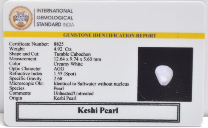 Beautiful 4.92 Cts Keshi Pearl (Top-Mines) sva 5+ Ratti KESHI PEARL. Free Horoscope & Free Pundit Ji Astrological Advise / Consultation. Original Natural Lab certified gems by IGI GTL / Birth stones / Large Gem Selection of shree shubh Rashi Ratan Vedic dhan at Gem Mines. May Bhagwan Brahma, Vishnu, Shiv & Universe bless you.