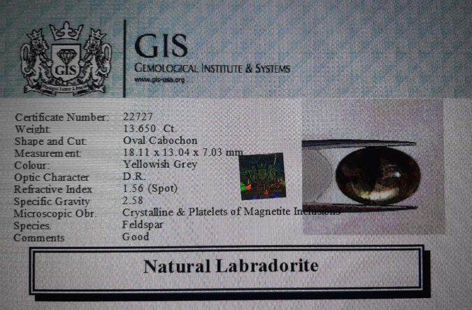 Beautiful 13.65 Ct. Labradorite (Canada Mines) Sava 15 Ratti. Free Horoscope & Free Pundit Ji Advise / Consultation. Original Natural Lab certified gems by IGI GTL / Birth stones / Large Gem Selection of shree shubh Rashi Ratan Vedic dhan at Gem Mines. May Bhagwan Brahma, Vishnu, Shiv & Universe bless you.