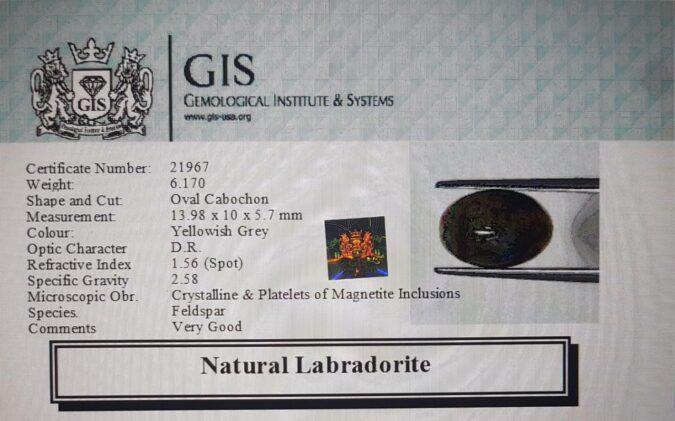 Beautiful 6.17 Ct. Labradorite (Canada Mines) Sava 6 Ratti Labradorite. Free Horoscope & Free Pundit Ji Advise / Consultation. Original Natural Lab certified gems by IGI GTL / Birth stones / Large Gem Selection of shree shubh Rashi Ratan Vedic dhan at Gem Mines. May Bhagwan Brahma, Vishnu, Shiv & Universe bless you.