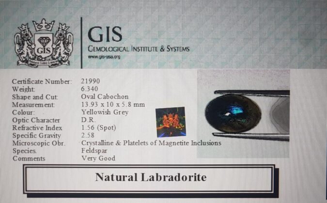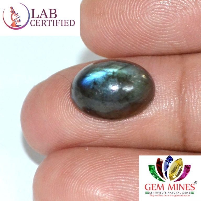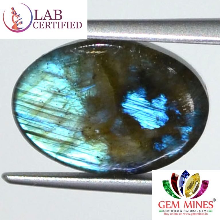 Beautiful 6.34 Ct. Labradorite (Canada Mines) Sava 7 Ratti Labradorite. Free Horoscope & Free Pundit Ji Advise / Consultation. Original Natural Lab certified gems by IGI GTL / Birth stones / Large Gem Selection of shree shubh Rashi Ratan Vedic dhan at Gem Mines. May Bhagwan Brahma, Vishnu, Shiv & Universe bless you.