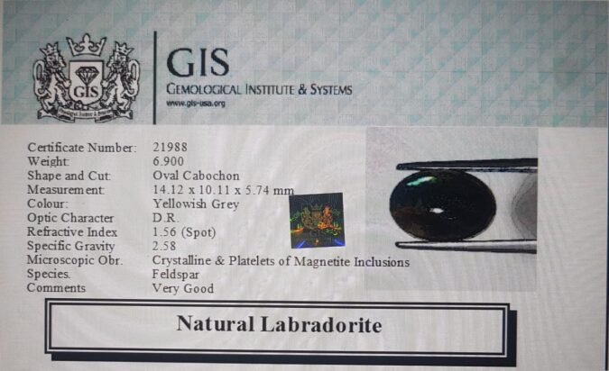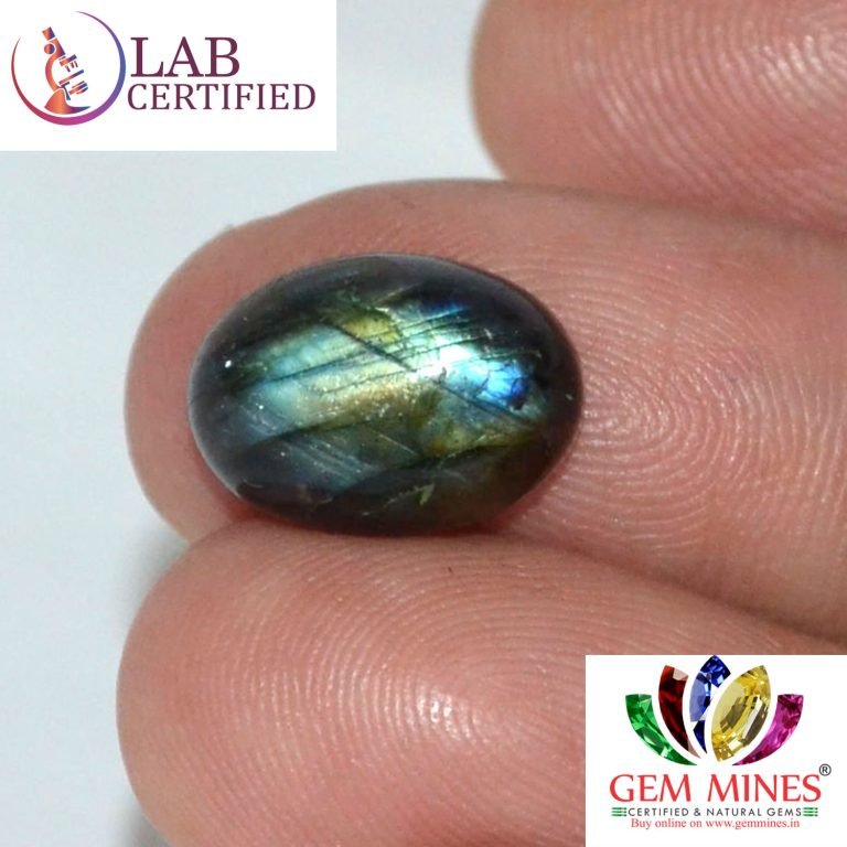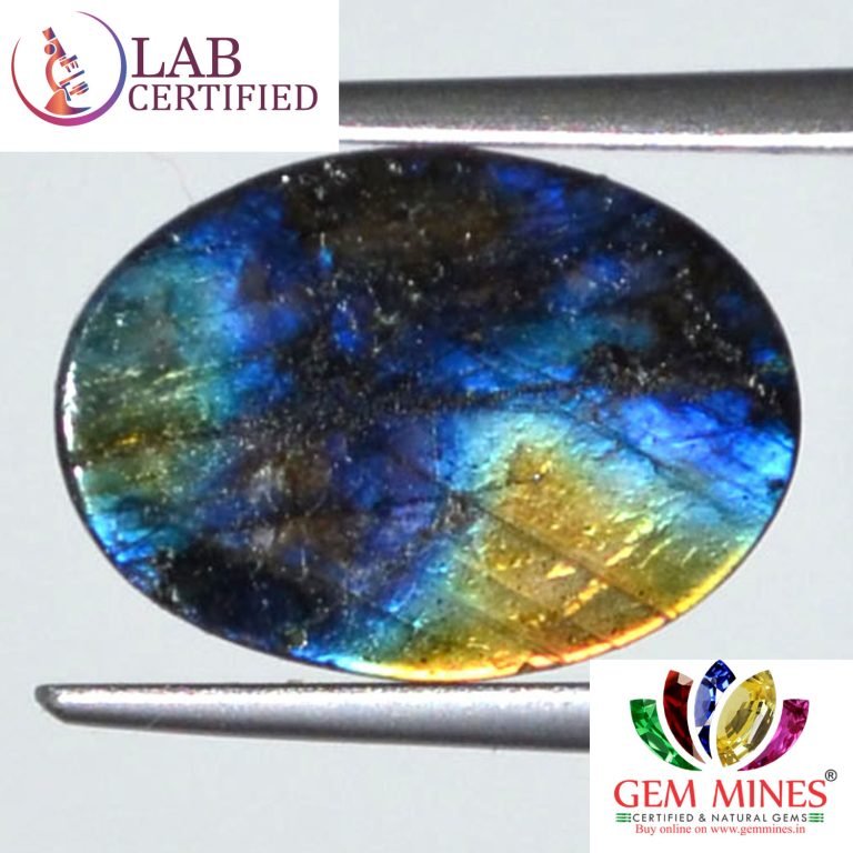 Beautiful 6.9 Ct. Labradorite (Canada Mines) Sava 7 Ratti Labradorite. Free Horoscope & Free Pundit Ji Advise / Consultation. Original Natural Lab certified gems by IGI GTL / Birth stones / Large Gem Selection of shree shubh Rashi Ratan Vedic dhan at Gem Mines. May Bhagwan Brahma, Vishnu, Shiv & Universe bless you.
