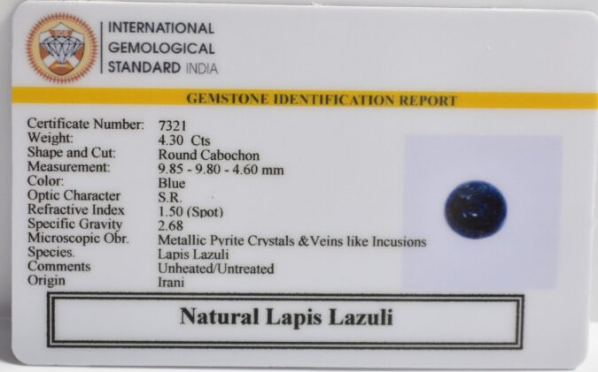 Beautiful 4.3 Cts Natural Lapis Lazuli (Top+-Mines) sva 4+ Ratti LAPIS LAZULI. Free Horoscope & Free Pundit Ji Astrological Advise / Consultation. Original Natural Lab certified gems by IGI GTL / Birth stones / Large Gem Selection of shree shubh Rashi Ratan Vedic dhan at Gem Mines. May Bhagwan Brahma, Vishnu, Shiv & Universe bless you.