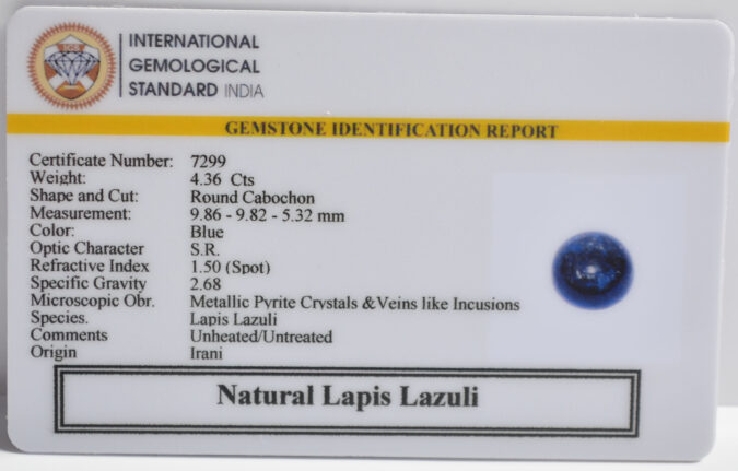 Beautiful 4.36 Cts Natural Lapis Lazuli (Top-Mines) sva 4+ Ratti LAPIS LAZULI. Free Horoscope & Free Pundit Ji Astrological Advise / Consultation. Original Natural Lab certified gems by IGI GTL / Birth stones / Large Gem Selection of shree shubh Rashi Ratan Vedic dhan at Gem Mines. May Bhagwan Brahma, Vishnu, Shiv & Universe bless you.
