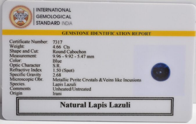 Beautiful 4.66 Cts Natural Lapis Lazuli (Top-Mines) sva 5+ Ratti LAPIS LAZULI. Free Horoscope & Free Pundit Ji Astrological Advise / Consultation. Original Natural Lab certified gems by IGI GTL / Birth stones / Large Gem Selection of shree shubh Rashi Ratan Vedic dhan at Gem Mines. May Bhagwan Brahma, Vishnu, Shiv & Universe bless you.