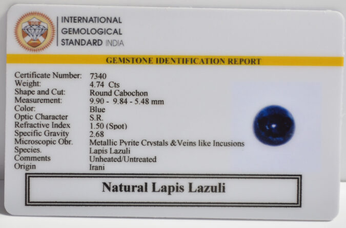 Beautiful 4.74 Cts Natural Lapis Lazuli (Top+-Mines) sva 5+ Ratti LAPIS LAZULI. Free Horoscope & Free Pundit Ji Astrological Advise / Consultation. Original Natural Lab certified gems by IGI GTL / Birth stones / Large Gem Selection of shree shubh Rashi Ratan Vedic dhan at Gem Mines. May Bhagwan Brahma, Vishnu, Shiv & Universe bless you.