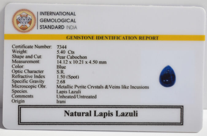 Certified Natural Lapis Lazuli 5.4 Ct.(6+ Ratti) in Pear Cabochon shape