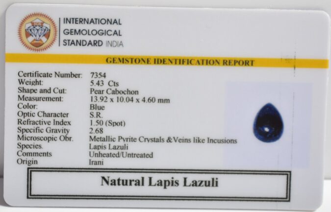 Beautiful 5.43 Cts Natural Lapis Lazuli (Top-Mines) sva 6+ Ratti LAPIS LAZULI. Free Horoscope & Free Pundit Ji Astrological Advise / Consultation. Original Natural Lab certified gems by IGI GTL / Birth stones / Large Gem Selection of shree shubh Rashi Ratan Vedic dhan at Gem Mines. May Bhagwan Brahma, Vishnu, Shiv & Universe bless you.
