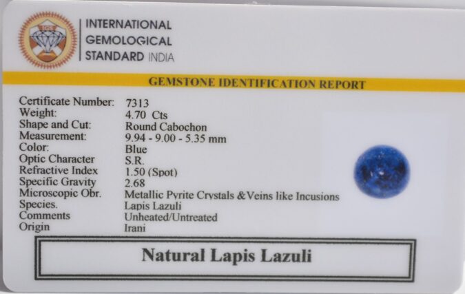 Beautiful 5.91 Cts Natural Lapis Lazuli (Top-Mines) sva 6+ Ratti LAPIS LAZULI. Free Horoscope & Free Pundit Ji Astrological Advise / Consultation. Original Natural Lab certified gems by IGI GTL / Birth stones / Large Gem Selection of shree shubh Rashi Ratan Vedic dhan at Gem Mines. May Bhagwan Brahma, Vishnu, Shiv & Universe bless you.
