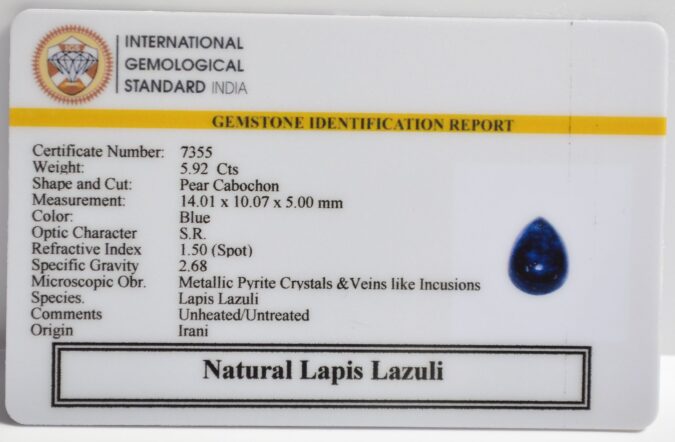 Certified Natural Lapis Lazuli 5.92 Ct.(6+ Ratti) in Pear Cabochon shape