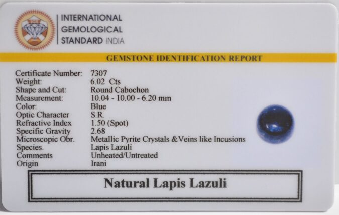 Beautiful 6.02 Cts Natural Lapis Lazuli (Top-Mines) sva 6+ Ratti LAPIS LAZULI. Free Horoscope & Free Pundit Ji Astrological Advise / Consultation. Original Natural Lab certified gems by IGI GTL / Birth stones / Large Gem Selection of shree shubh Rashi Ratan Vedic dhan at Gem Mines. May Bhagwan Brahma, Vishnu, Shiv & Universe bless you.